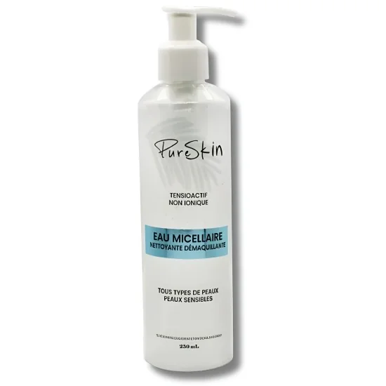 Pure Skin – Eau Micellaire 250ml : nettoie, démaquille et hydrate en douceur, tout en respectant les peaux sensibles.