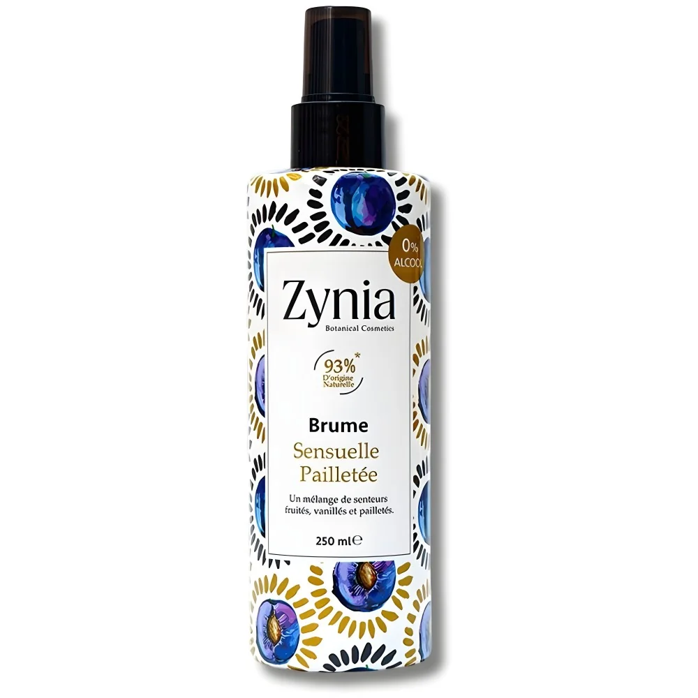 Brume parfumée sans alcool ZYNIA 250ML aux notes fruitées et vanillées, enrichie en paillettes pour sublimer la peau naturellement.
