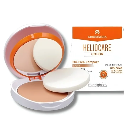 Heliocare Compact Oil Free Light SPF 50 est un fond de teint solaire haute protection qui unifie le teint, matifie la peau et prévient le vieillissement cutané, idéal pour les peaux mixtes à grasses.