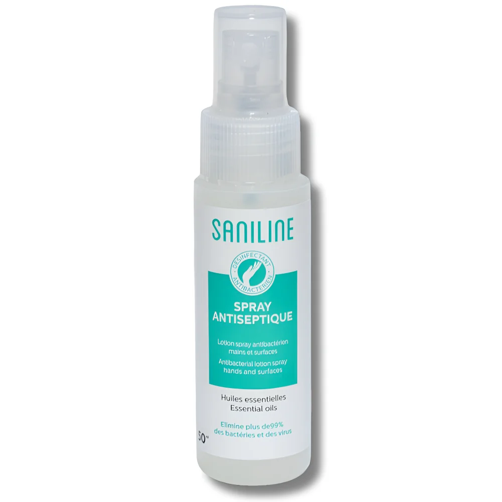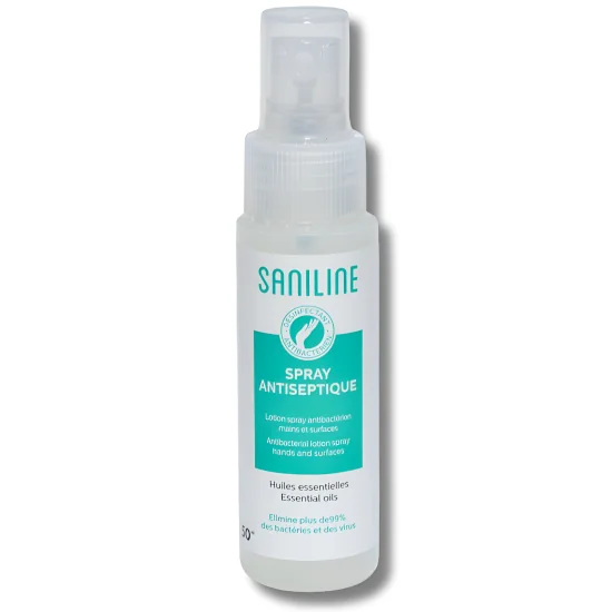 Lotion hydroalcoolique aux huiles essentielles pour désinfecter mains et objets rapidement sans eau ni savon.
